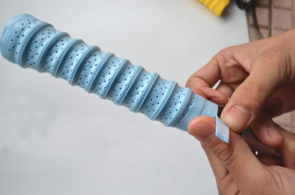 一只新的球拍,在拍柄上會(huì)有一柔軟的皮包裹著,它是為防止運(yùn)動(dòng)員在使用時(shí)因手部用力過(guò)大或時(shí)間太久而被拍柄磨出血泡或磨破皮。 所以建議大家在球拍纏上吸汗帶。